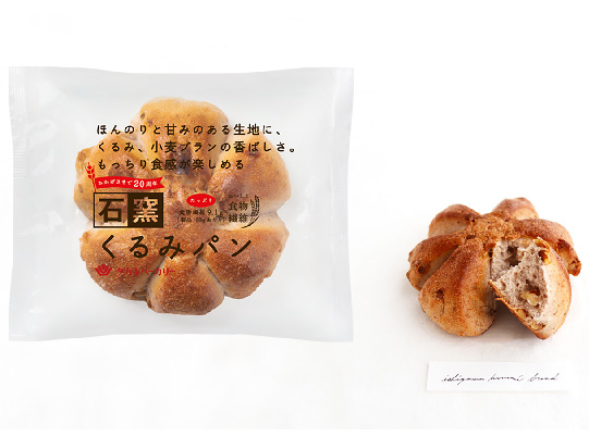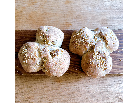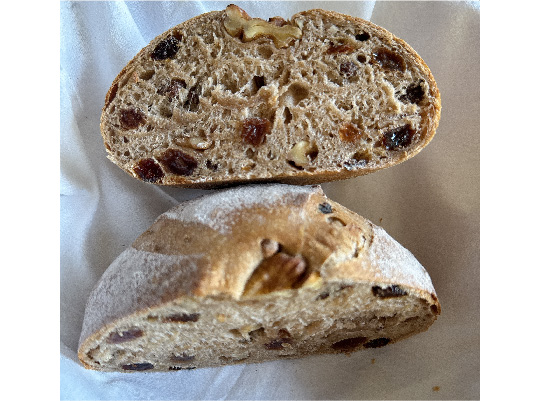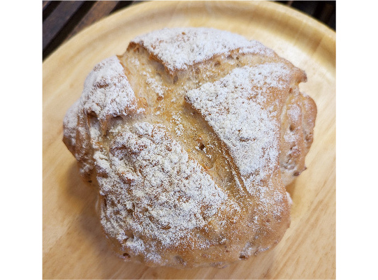 ほんのり甘みのある生地に、カリフォルニア産くるみを混ぜ込み、石窯でもっちりと焼き上げました。自家製発酵種の豊かな風味、種子島産粗糖の甘みを効かせた味わい深い生地に、大粒のくるみがごろごろ!