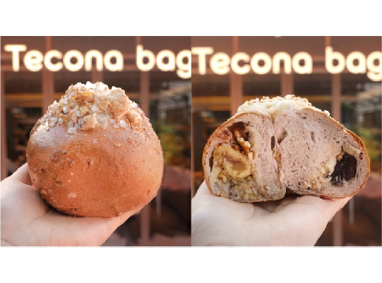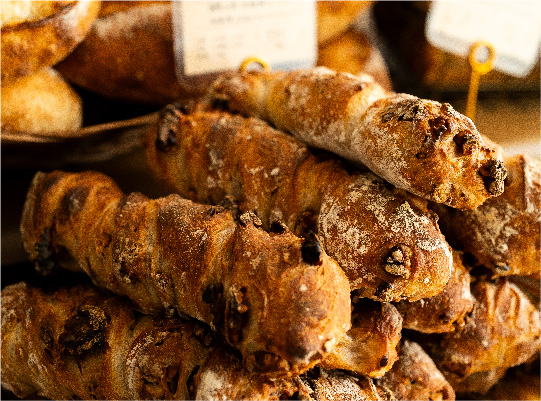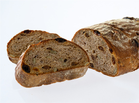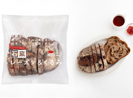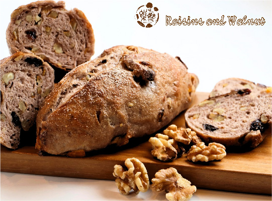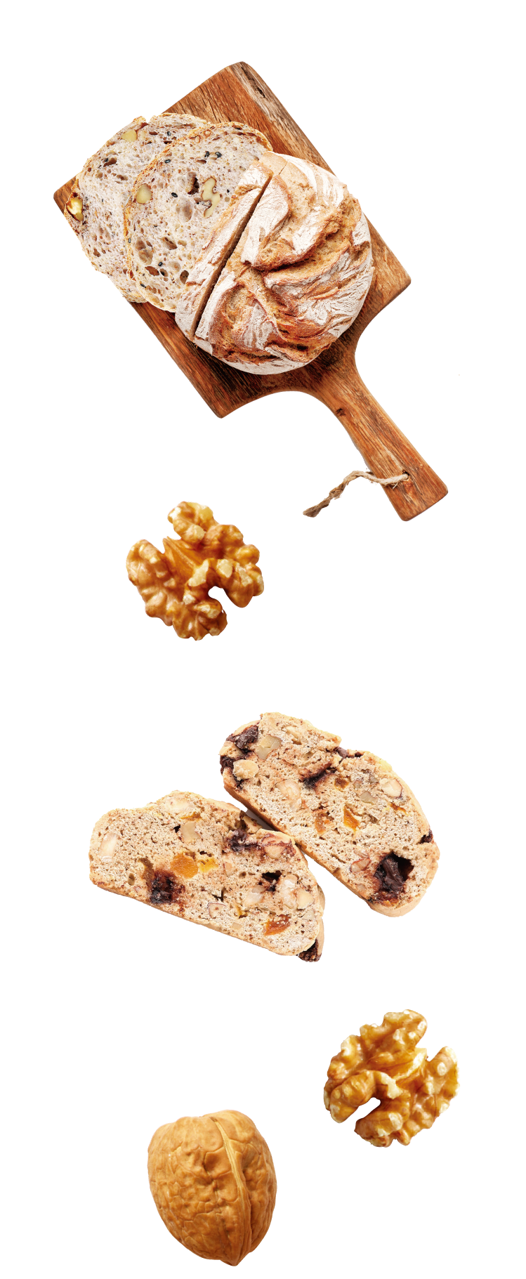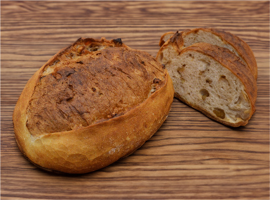 あらかじめ小麦と麹をあわせて澱粉を分解。甘さを十分に引き出した上、北海道産キタノカオリの全粒粉を40%入れた歯切れの香りの良い全粒粉生地に、胡桃・レーズン・オレンジピールを入れました。