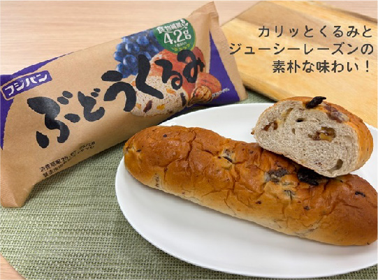 レーズンとくるみをしっとりやさしい甘さのコッペパンに練り込みました。カリッとしたくるみとジューシーなレーズンが味わえる素朴な味わいです。1個当たり食物繊維4.2gです。