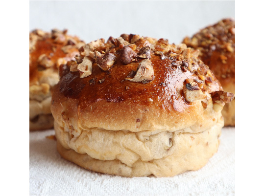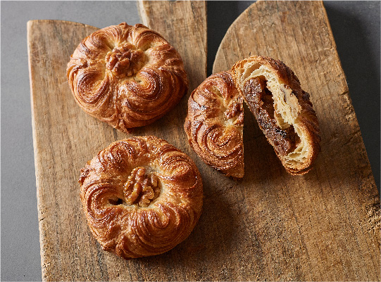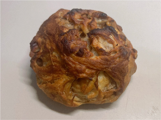 くるみやキャラメル、レーズン、はちみつなどを合わせた香ばしいフィリングをデニッシュ生地で包みました。ナッツの香ばしさ、レーズンの甘みがアクセントになっています。