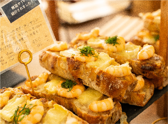 高加水生地にくるみを混ぜ込んだパンを使った、エビとカマンベールのオープンサンド。くるみの食感と、エビのぷりっとした弾力がよく合います。味噌ソースと大葉がくるみの香ばしい風味のアクセントに。
