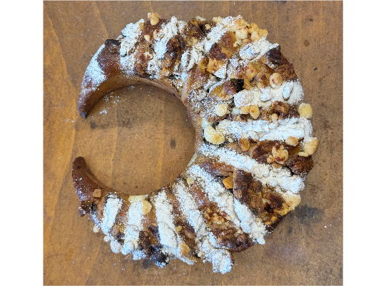 パネトーネ種を配合したくるみ生地に、イラン産の樹上完熟デーツを巻き込みました。デーツの甘みとくるみの香ばしさを味わえるパンです。