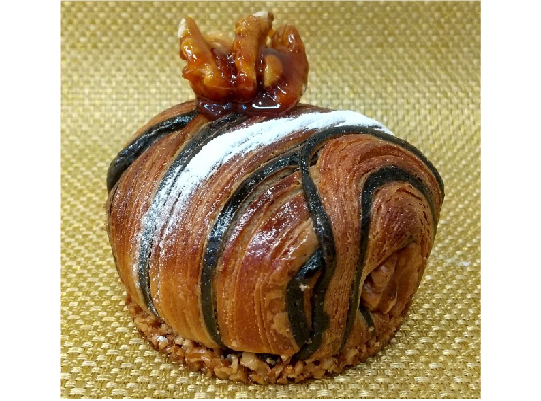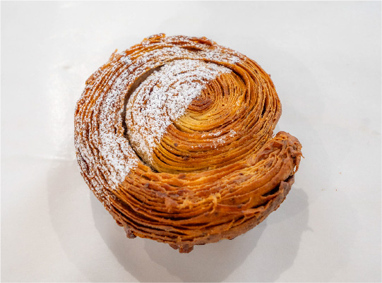 低温熟成製法のバケット生地、クロワッサン生地を1対1で混ぜ込み、ローストしたクルミ、黒糖をさらに折り込み焼き上げました。クルミの食感と黒糖のコクのある甘みが良く、発酵バターの風味とサクサクと食べやすい食感に仕上がっています。