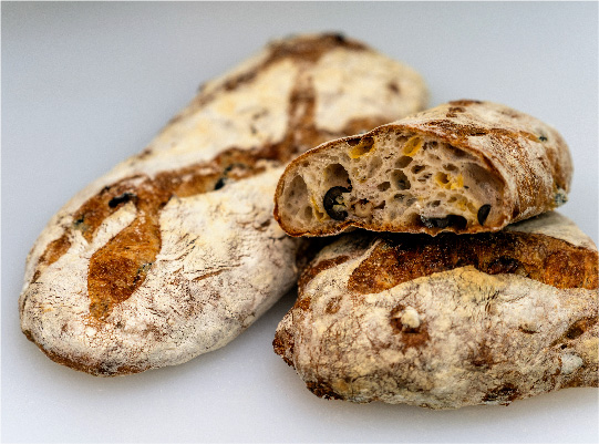 高加水のしっとりもちもちの生地に、クルミ・ブラックオリーブ・ブルーチーズ・チェダー・モザレラを混ぜ込み高温で香ばしく焼き上げました。スライスしてトーストすると外はカリカリ、中はモチモチでお食事からおつまみまで幅広いシーンでどうぞ!