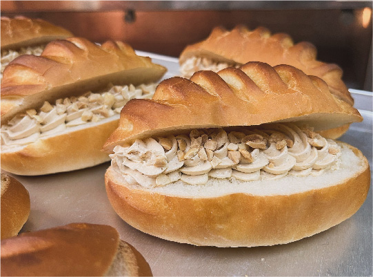 くるみをたっぷり使用した生地に2種類の栗とラム酒がほんのり香るモンブランクリームを贅沢に詰めこみました。ぜひ大きな口でパクッと、今までにないベーグルをお楽しみください。