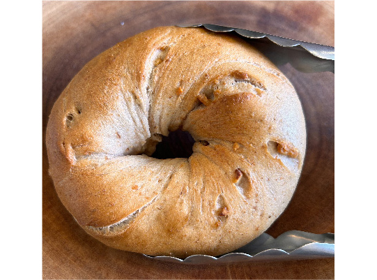 粉・富山県産ゆきちから全粒粉・北海道産小麦粉を生地に配合した、くるみをたっぷり練り込んだ“ふわもち”食感のベーグル。茹でることでもちもちっとした独特な歯応えがありながらも、くるみの良質な油分で歯切れ良く!